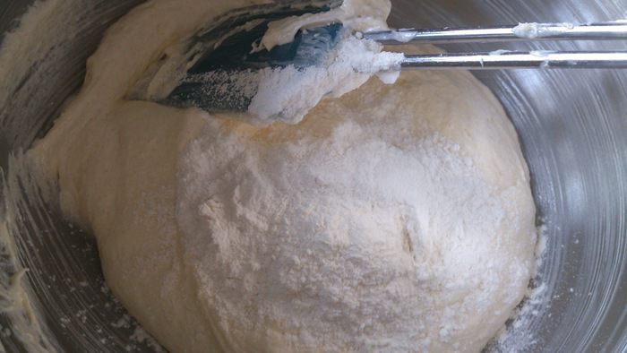 Посыпать немного просеянной муки,тщательно перемешивая.