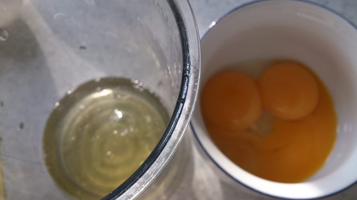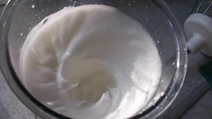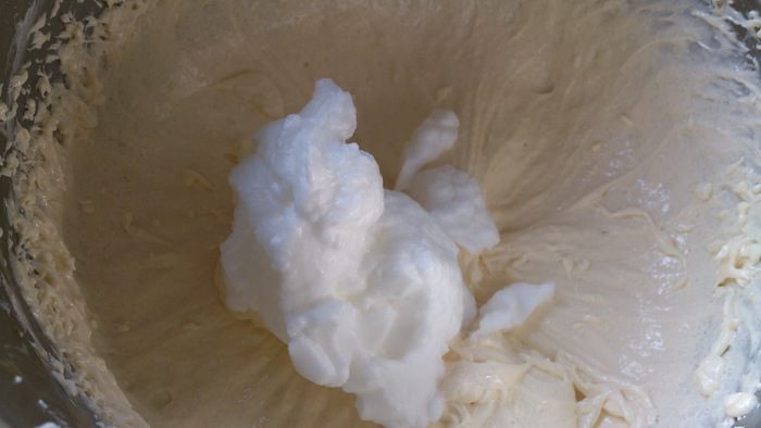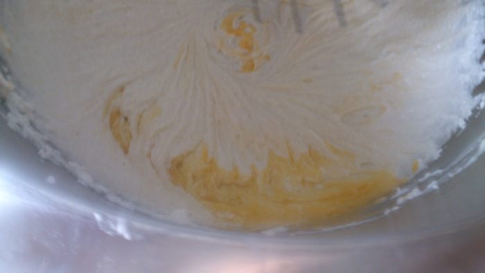 Добавить в масляную смесь немного белков, аккуратно перемешать.