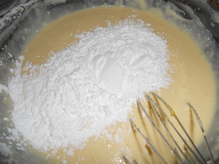 Всыпать муку, желательно просеянную, перемешать венчиком, добавить крахмал, еще раз хорошо перемешать.