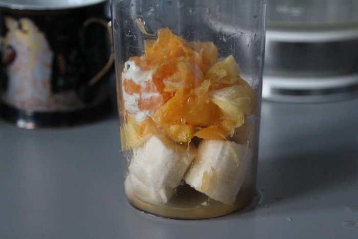 Фрукты переложить в блендер и пробить.