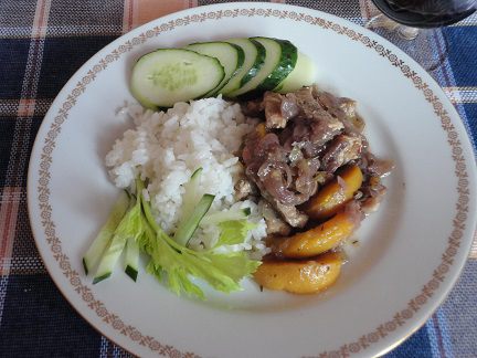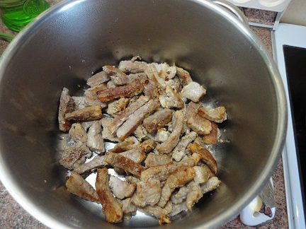 Добавить уксус, вино, бульон, довести до кипения. В соус выложить мясо и тушить на медленном огне 30 минут. Посолить, поперчить, добавить нарезанные дольками персики или сливы, довести до кипения, выключить и оставить на плите настаиваться минут 20.