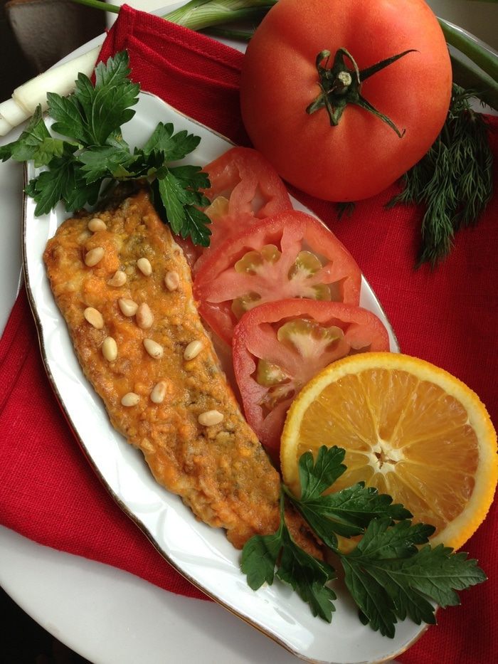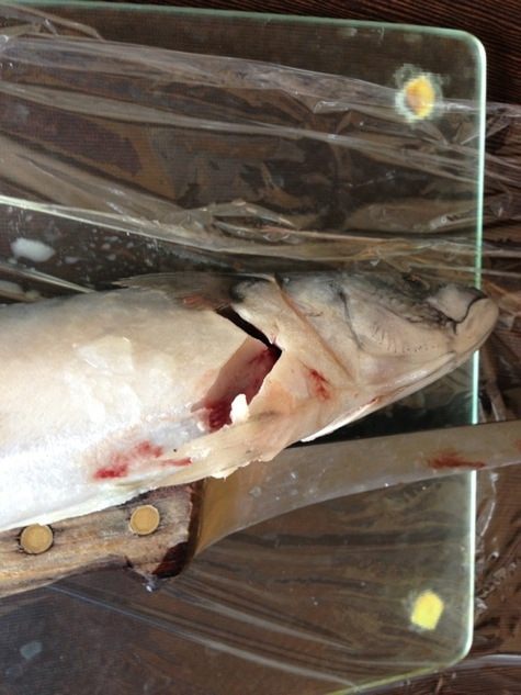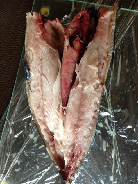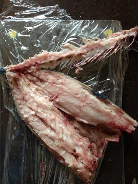 Отрезаю кулинарными ножницами все лишнее (хвост с хребтом, боковые части с косточками). Разрезаю рыбу на 2 филе, провожу пальцем вдоль от хвоста к голове рыбы и нахожу оставшиеся косточки, при помощи пинцета удаляю их.