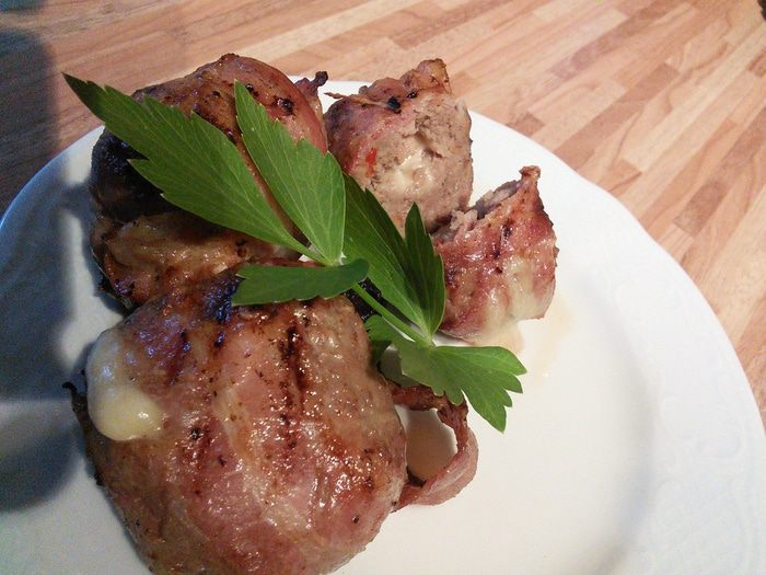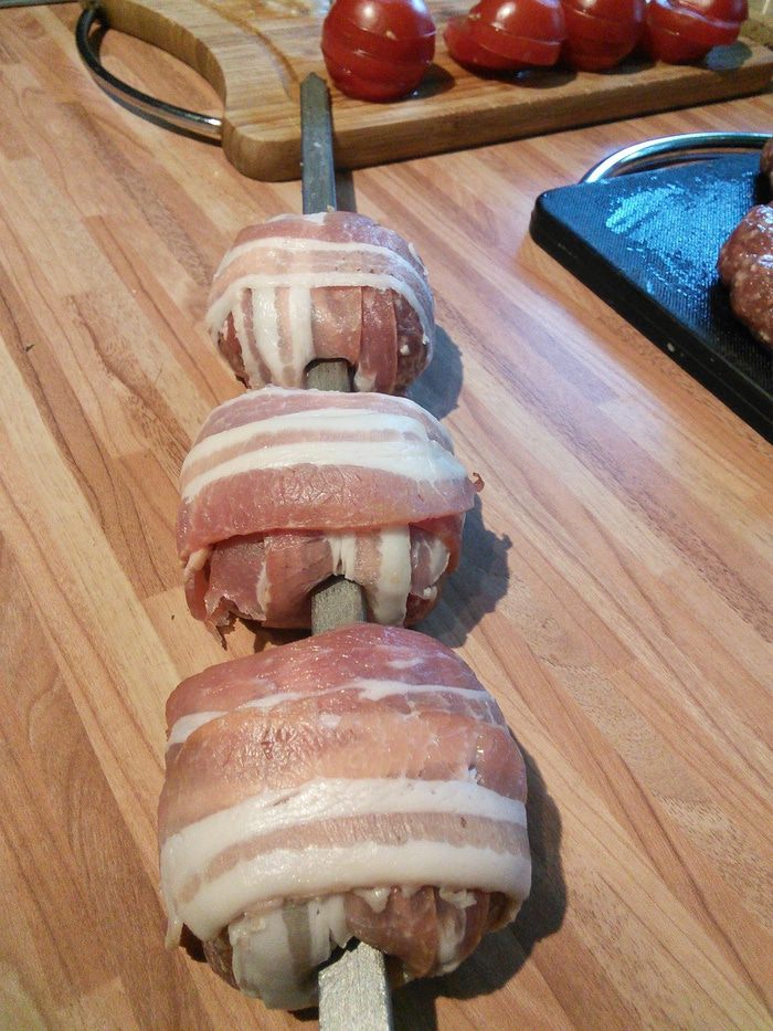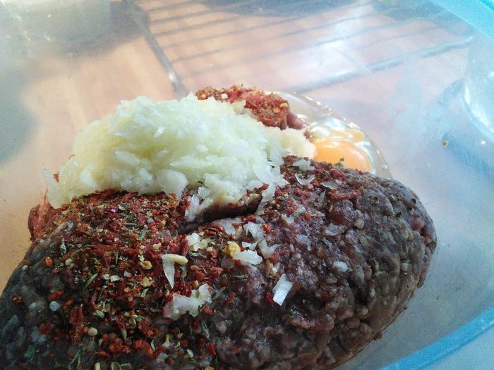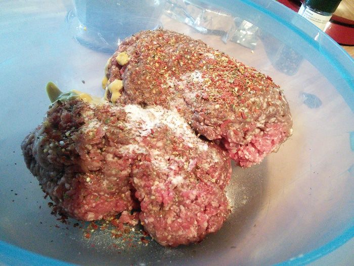 Подготовить фарш (у меня говядина+свинина). Посолить, поперчить, добавить специи ( у меня смесь готовых специй для "тапас"), горчицу, соду. Соду добавляю всегда, когда хочу обойтись без белого хлеба. В изделиях из фарша сода помогает удерживать все соки и обойтись без лишних углеводов.