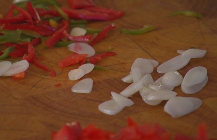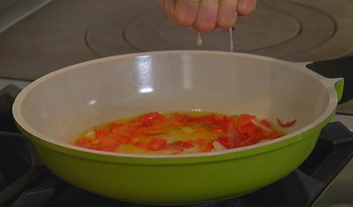 Разогреть в сковороде оливковое масло, выложить чили, сладкий перец и чеснок, немного обжарить и выключить огонь.
