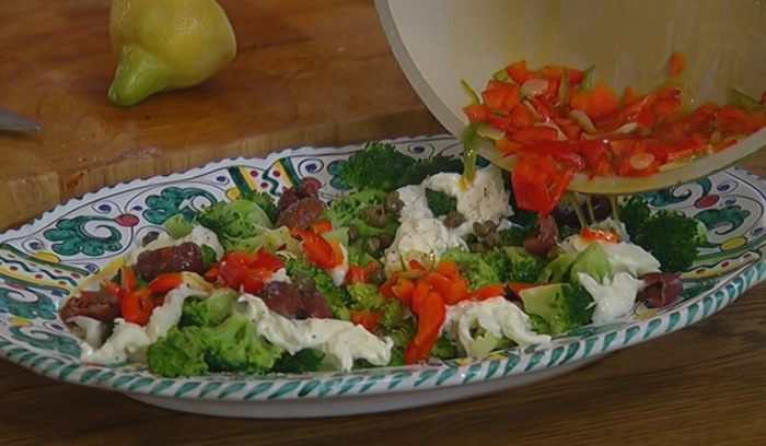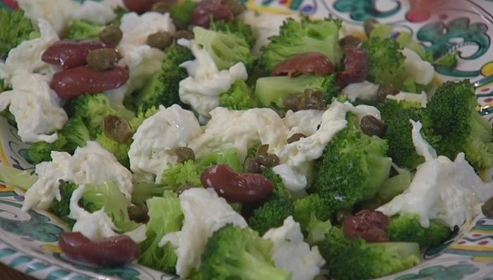 Выложить на тарелку горячую брокколи, буррату, оливки и каперсы, все посолить и поперчить.