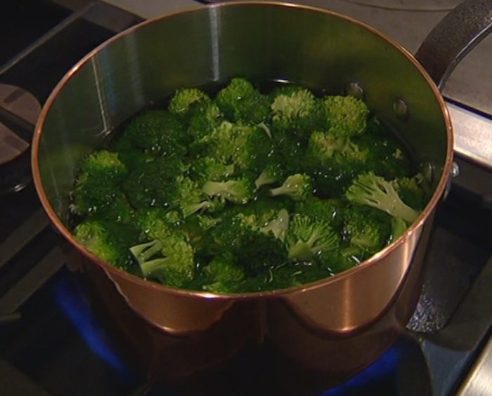 В большой кастрюле вскипятить воду и отправить туда брокколи на 1–2 минуты, затем откинуть на дуршлаг.