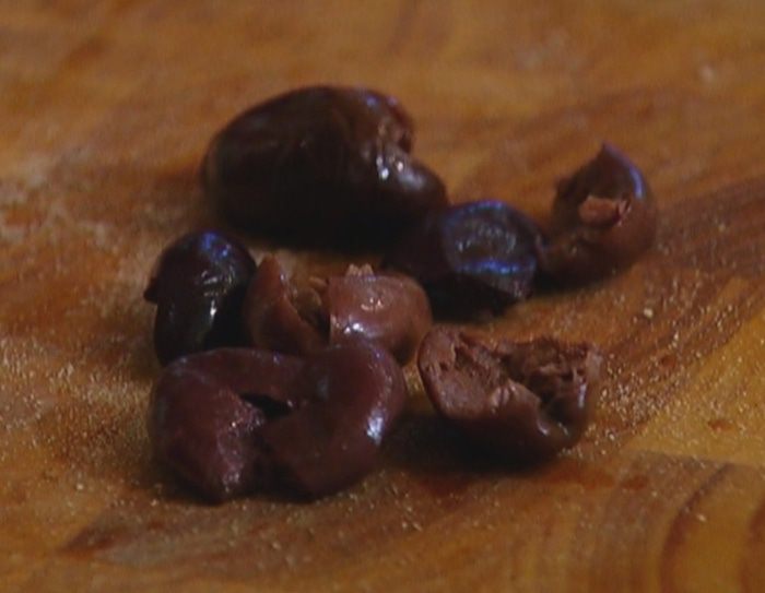 Оливки разломить пополам.