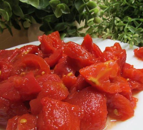 С томатов снять шкурку. Томаты нарезать крупными кубиками.