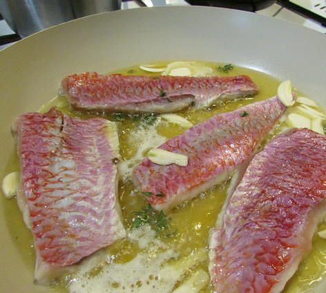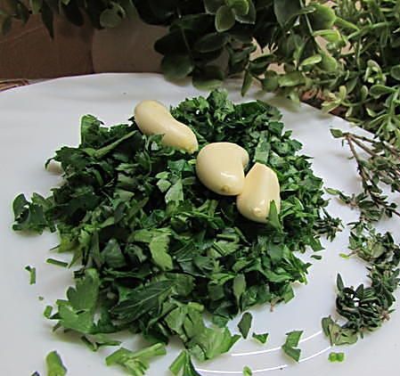 Затем обжарить на оливковом масле с одной стороны (со светлой) с добавлением оставшегося тимьяна, сливочного масла и рубленного чеснока.