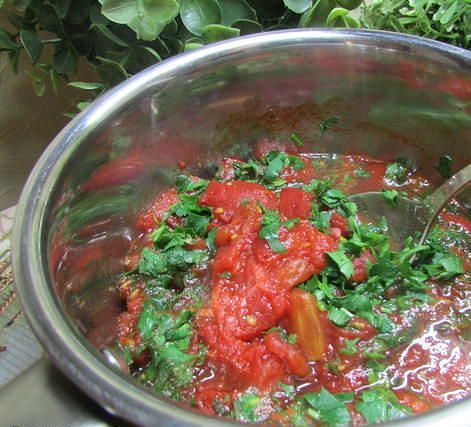 Выложить томаты в сотейник и довести до кипения, приправить солью и перцем, добавить сахар, рубленную зелень. Дать закипеть и выключить огонь.