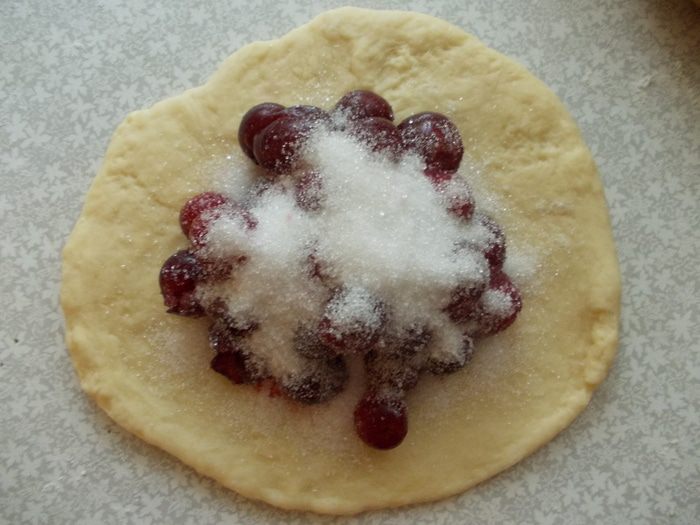 Тесто раскатать, выложить вишню, обильно посыпать сахаром. Скрепить хорошо края.