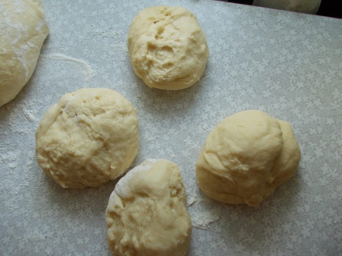 Стол обильно посыпаем мукой. Выкладываем муку и хорошо замешиваем тесто, что бы вышел весь воздух. Делим тесто на шарики. Духовку разогреваем до 180 градусов.