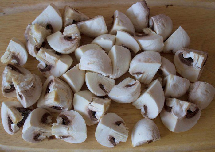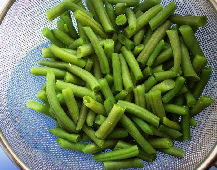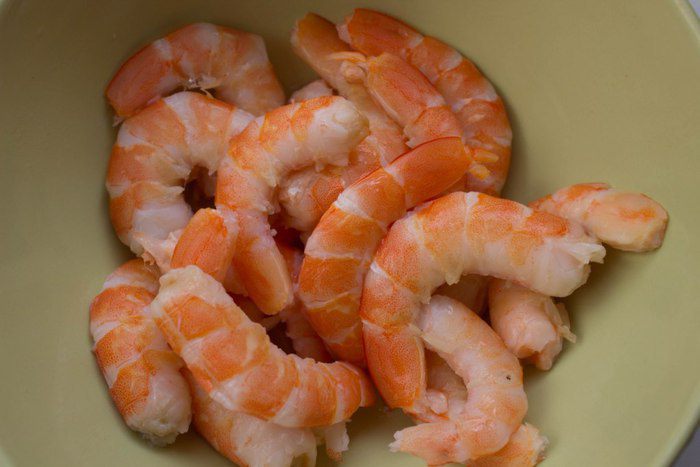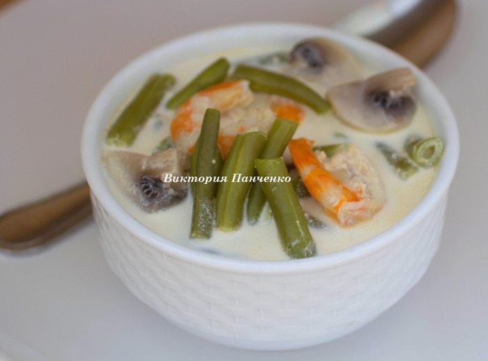 В кипящий отвар добавить сметану и сливочное масло, дать полностью раствориться. Добавить грибы и фасоль, готовить 3 минуты на слабом огне. Положить креветки и влить перемешанный желток. Постоянно мешать ложкой, чтобы не дать сметане и желтку свернуться. Должен получиться густой однородный соус. Приправить солью и перцем, подавать горячим. Приятного аппетита!!!