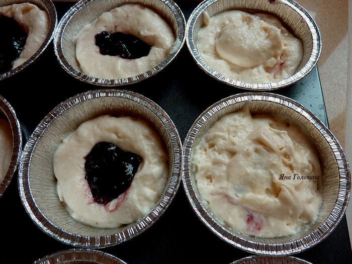 Формочки для кексов заполнить на 2/3 тестом, разложить на тесто по 1 чайной ложки варенья, по верх варенья распределить оставшейся тесто.