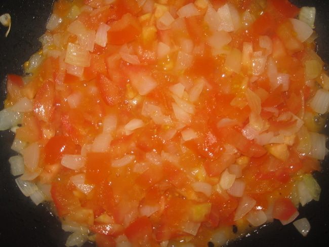 Затем добавляем мелко нарезанные или тертые на терке томаты. Солим, добавляем специи. Перемешиваем и жарим 5-7 минут.