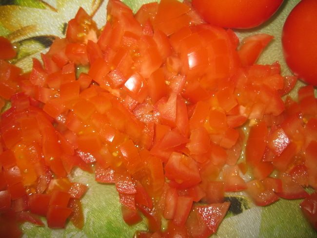Моем и мелко нарезаем помидоры.