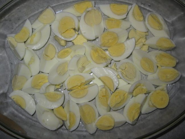 Вареные яйца разрезаем на дольки или четвертинки в форму с растительным маслом..