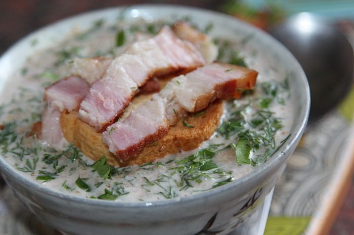 Собираем наше блюдо: наливаем в тарелку суп, нарезаем и добавляем зелень (мы любим побольше), сверху выкладываем подсушенный сухарик и на него нарезанную грудинку. Приятного аппетита!