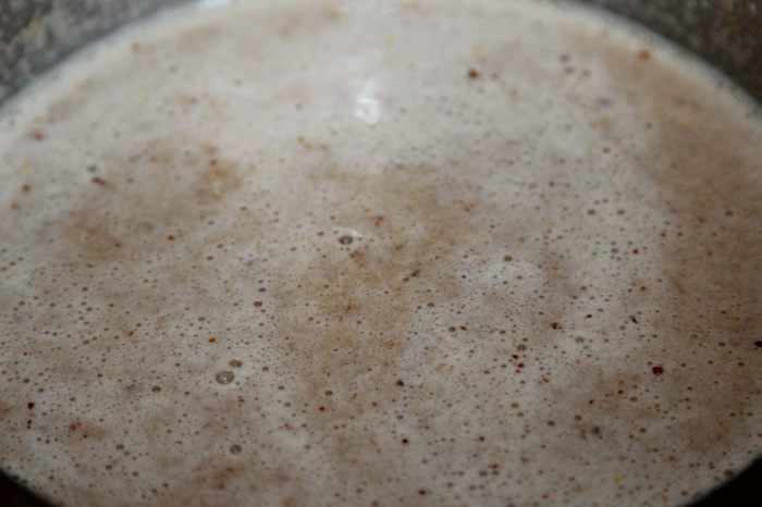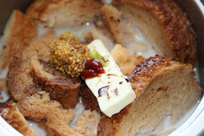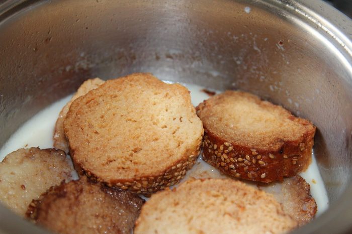 В бульон добавляем подогретое молоко и выкладываем подсушенные кусочки багета. Оставляем на 10 минут под крышкой (без огня) чтобы сухари протомились и напитались бульоном.