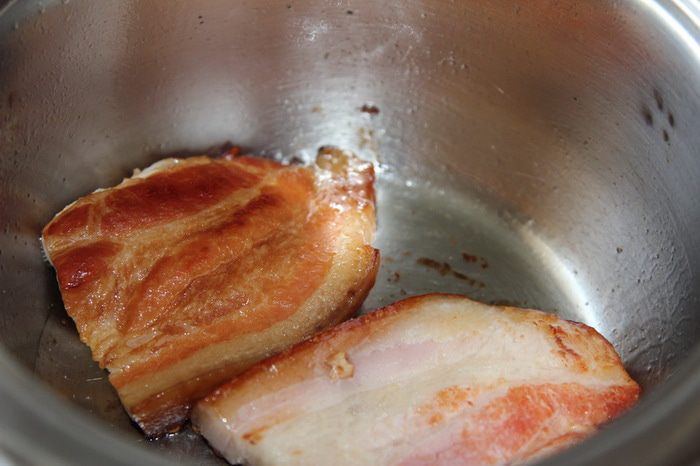 Грудинку нарезаем крупными кусками и поджариваем в кастрюле с толстым дном. Лишний жир сливаем.