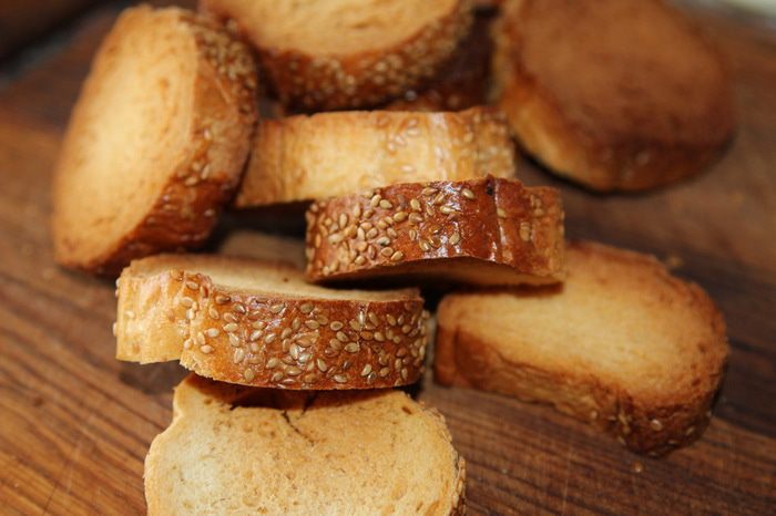 В это время нарезаем багет на кусочки, толщиной около 1 см и подсушиваем в духовке до румяного состояния.