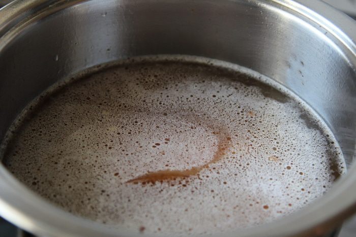 Заливаем грудинку бульоном (у меня куриный, но если нет бульона, вполне подойдет и простая вода. Бульон все-равно получится насыщенным) и готовим на сильном огне 10 минут. Затем огонь убавляем до минимума и под крышкой готовим еще 30 минут.