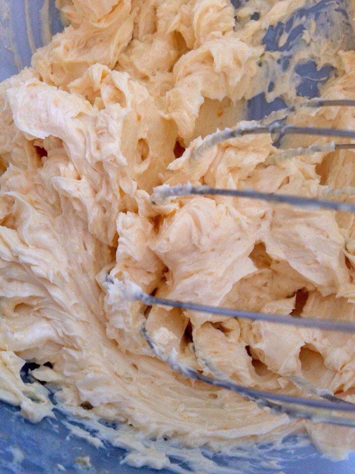 Яйцо взбить с сахаром в пену. Добавить мягкое сливочное масло и взбивать до получения пышного крема.