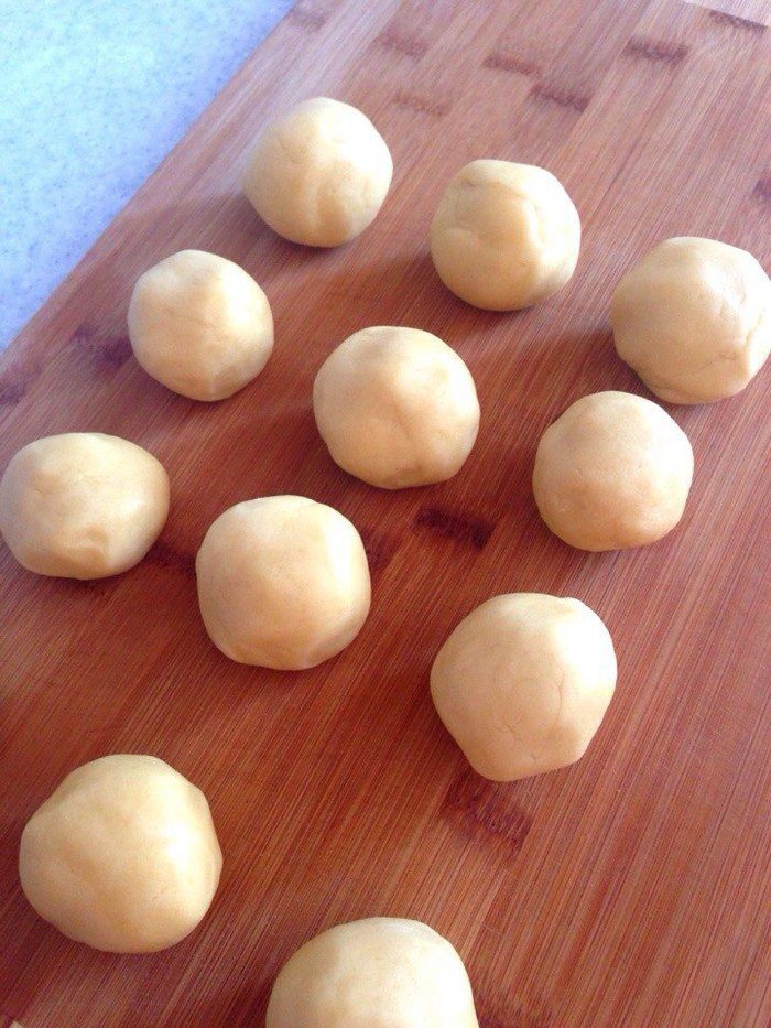 Затем тесто достать из холодильника. Отделять от него кусочки размером с грецкий орех и формировать шарики (из этого количества получается примерно 13 штук).