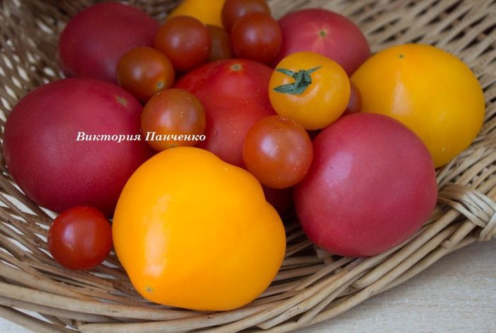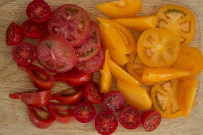 Для этого салата нужны помидоры разной формы и разного цвета...