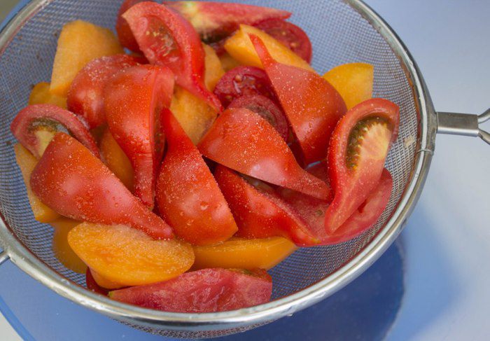Сложить порезанные помидоры в дуршлаг, посыпать солью, перемешать и оставить на 20 минут, чтобы стек лишний сок.