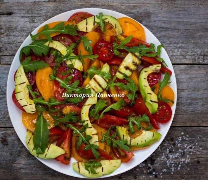 Выложить на блюдо помидоры, посыпать руколой, сверху выложить ломтики авокадо. Заправить оливковым маслом и бальзамическим уксусом. Подавать с хрустящим хлебом.