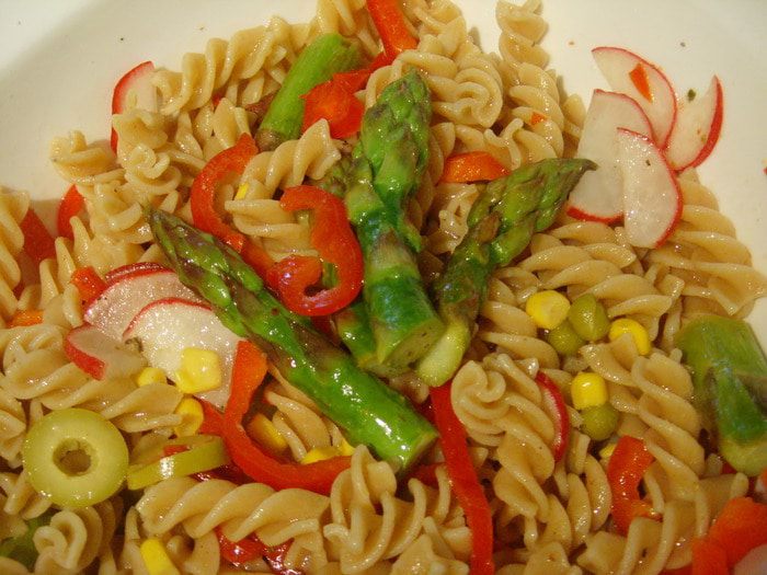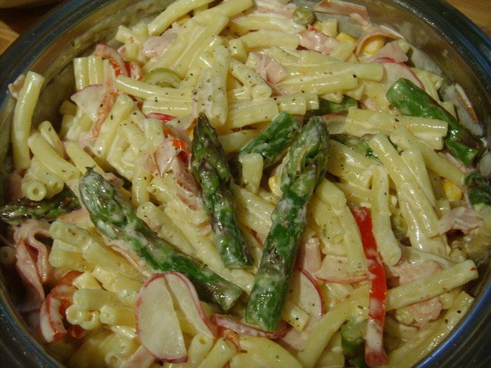 Макароны ( любые) отварить аль денте, Спаржу очистить, порезать на кусочки около 3 см. и отварить в подсоленной кипящей воде в течении 5 мин. Все остальные ингредиенты нарезать, соединить между собой, смешать с макаронами, солью, перцем, заправить майонезом.