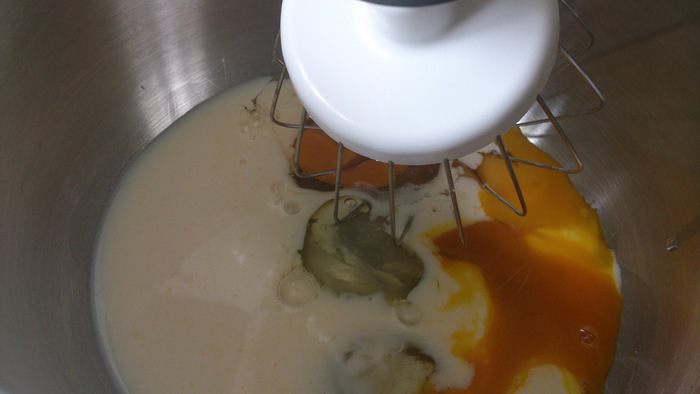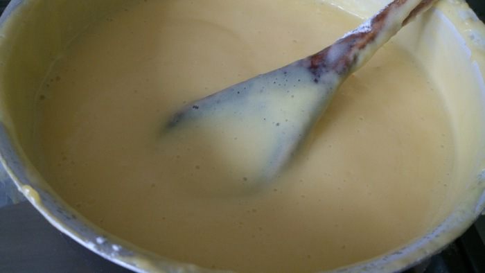 Вот тут есть один важный момент. Если вы уверены, что предыдущий шаг сделали правильно, то можно сразу эту смесь вливать в горячее молоко. При этом постоянно помешивать. Ничего не свернется - проверено! Но если уверенности нет, то лучше влить немного молока в яичную смесь, размешать и только потом добавить все это в ковшик с молоком.