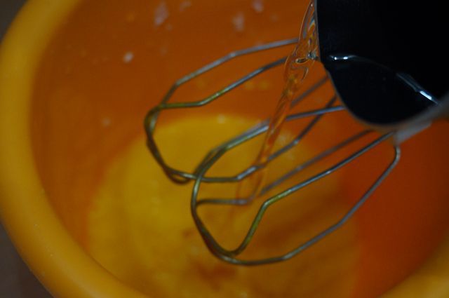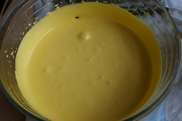 Желтки слегка взбиваем, тонкой струйкой вливаем сироп и продолжаем взбивать до образования светлой пены.