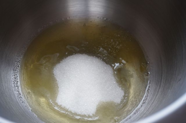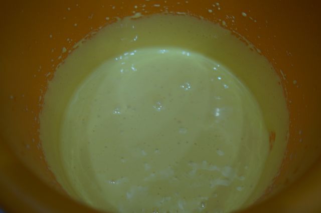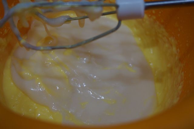 В это время желтки +60 г сахара растираем добела.
