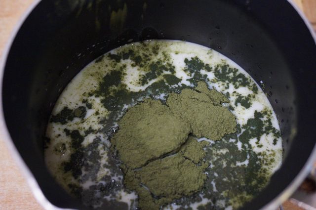 Чайный мусс. Молоко + матча - хорешенько размешать венчиком, чтобы не было комочков.