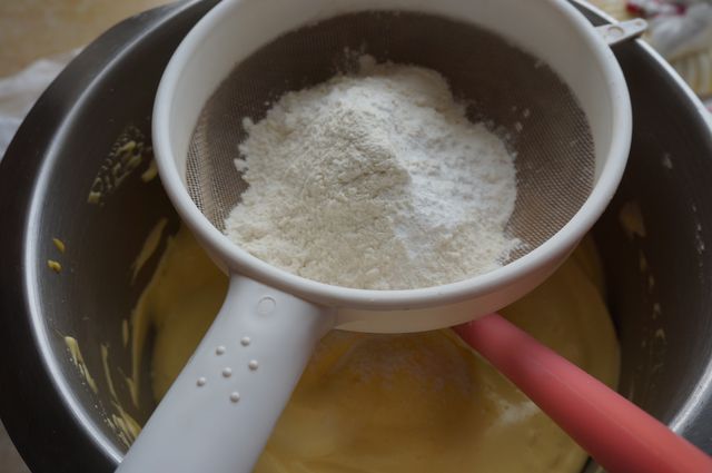 Просеиваем муку, лопаткой снизу вверх, смешиваем с яйцами.