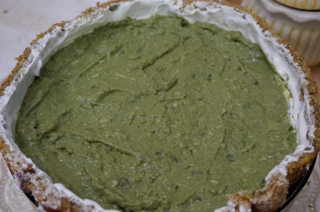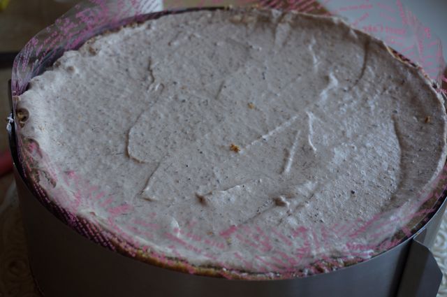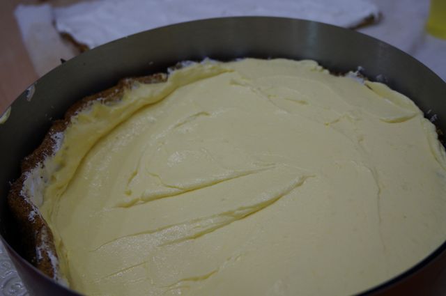 Выкладываем на корж, разравнивая суфле так, чтобы "подпереть банановый бортик", ставим в холод.