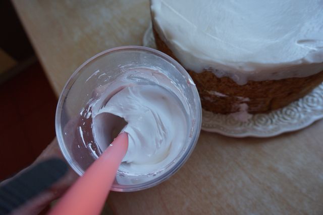 Еще мне захотелось, чтобы тортик был со светлыми бочками, поэтому я взбила 1 белок с 55 г сахарной пудры и каплей лимонного сока, этой глазурью обмазала торт.