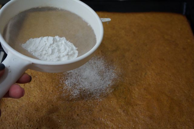 Готовый бисквит посыпаем обильно сахарной пудрой.