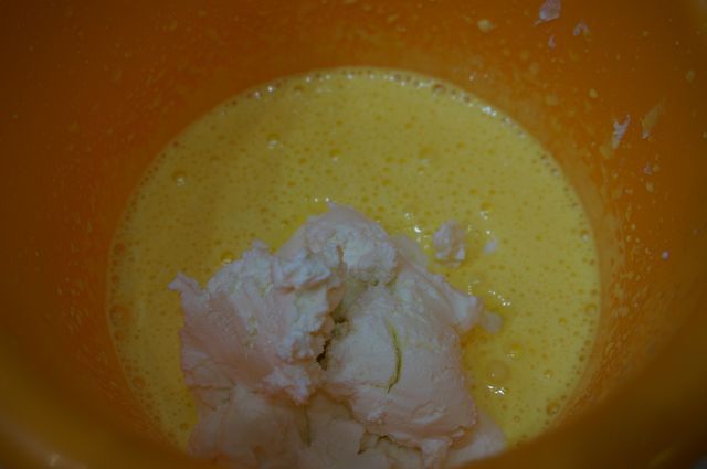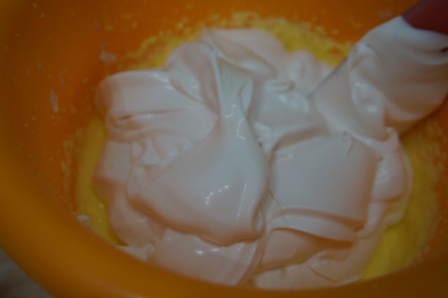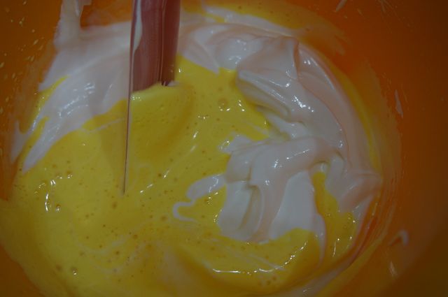 Вливаем желтки к белкам, взбиваем, либо аккуратно соединяем ложкой.