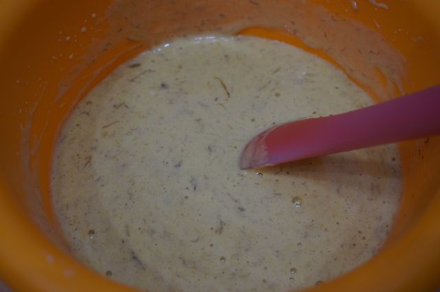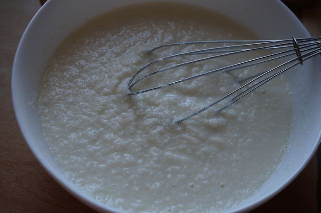 Вливаем молочный кисель к яично-творожной массе, размешиваем.