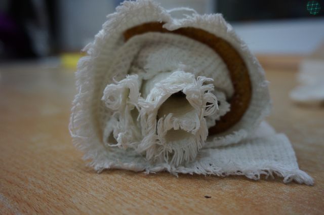 Накрываем чистым полотенцем, снимаем с противня и сворачиваем в рулет.