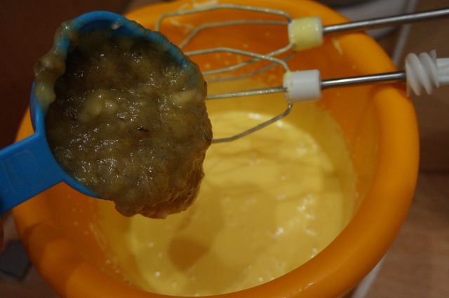 Во взбитые яйца добавляем банановое пюре, размешиваем.