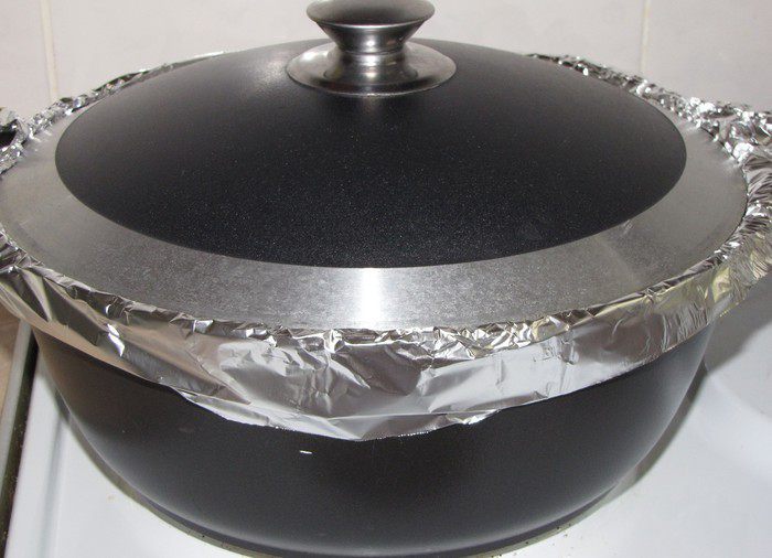 Закрыть казан крышкой очень плотно. Ведь все верхние слои должны готовиться на пару. Если крышка прилегает не очень плотно, то можно обмотать место стыка крышки и края казана фольгой. Томить 2 часа.