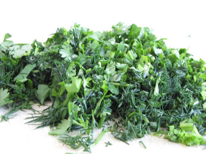 Поверх лука также плотно уложить слоями остальные компоненты: морковь, помидоры, нарезанную зелень. Зелень посыпать измельченным чесноком.