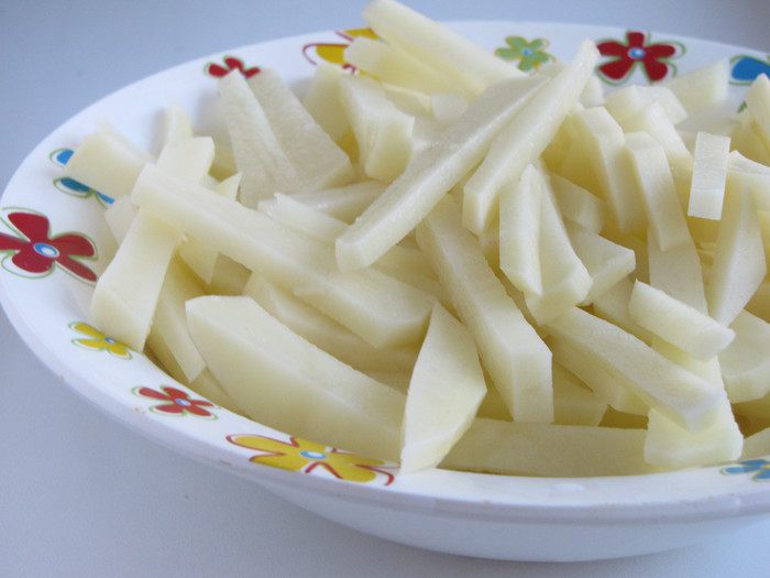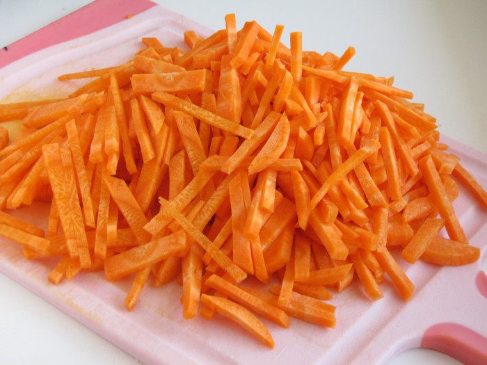 Пока мясо маринуется, займемся овощами. Морковь нарезать короткой соломкой.
