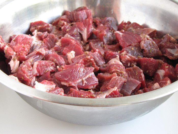 Баранину нарезать кусочками - размером с вишенку. Перемешать с половиной специй, подержать в холодильнике 2 часа. Я взяла мяса в два раза больше, чем указано в рецепте.