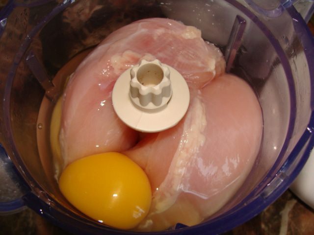 Готовим тесто. Куриную грудку и яйцо измельчить в блендере. Посолить, поперчить.