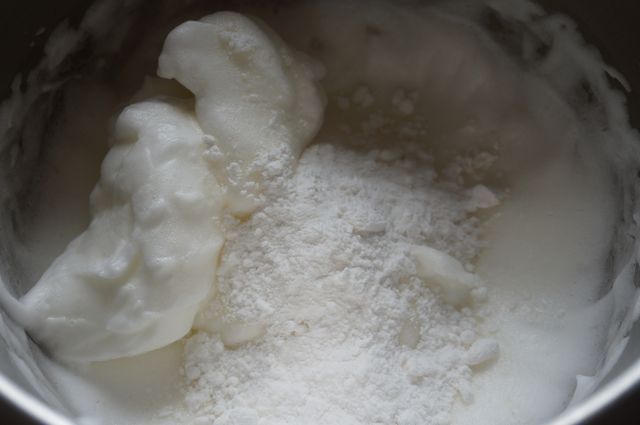 Белки взбить, постепенно добавляя сахарную пудру, до устойчивых пиков.